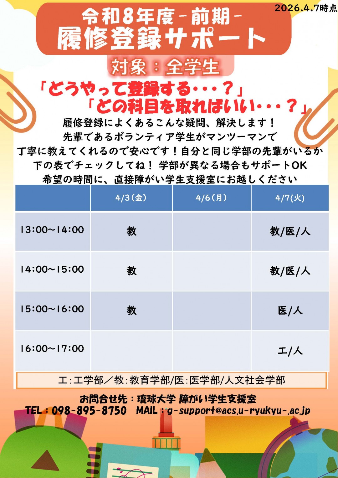 履修登録サポートについてご不明な点がございましたら、お気軽に障がい学生支援室までご相談ください。